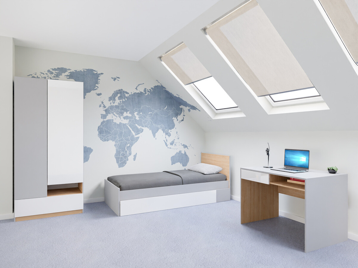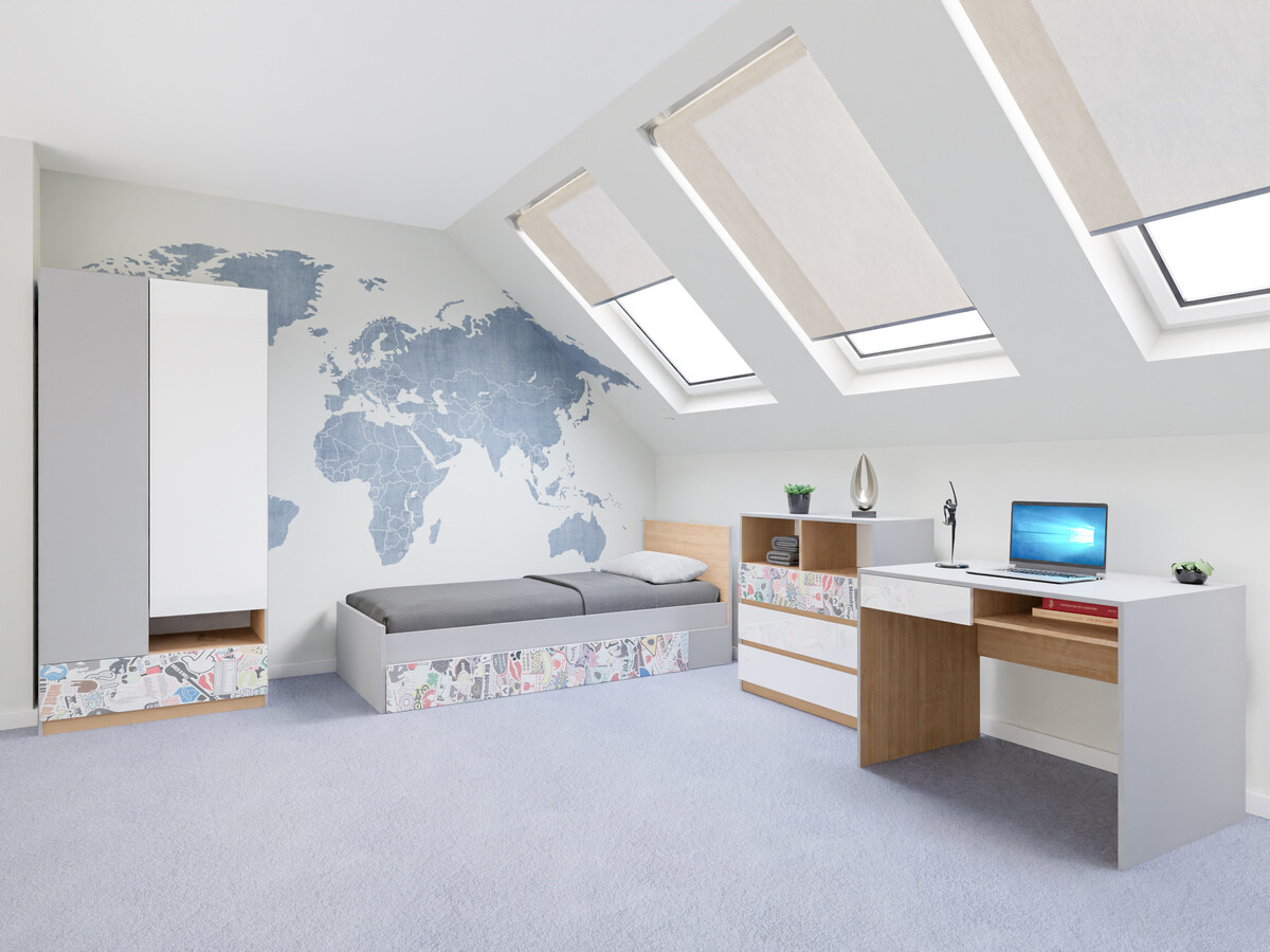 U dječjoj sobi ili sobi za mlade, važno je održati ravnotežu između dizajna i funkcionalnosti. U ovom prostoru možete pustiti mašti na volju, bez straha od svijetlih boja ili elemenata drugačijeg dizajna. U kolekciji, inovacija i kreativnost idu ruku pod ruku. Namještaj iz ove kolekcije jasnih je oblika, svijetlo sive boje, boje hrasta i sjajno bijele boje. Namještaj kombinira neutralne boje i šarene elemente koji upotpunjuju dizajn kao naglasak te se savršeno uklapaju u cjelinu. Nismo zaboravili one koji nisu ljubitelji svijetlih elemenata - u ovoj kolekciji također ćete pronaći namještaj neutralnih boja. Prostran namještaj s otvorenim i zatvorenim odjeljcima pružit će Vam fleksibilnost. Površine namještaja prekrivene su bezbojnim materijalom koji štiti od manjih ogrebotina. U vrata i ladice ugrađen je mehanizam tihog zatvaranja koji će Vam pružiti dodatnu udobnost prilikom upotrebe namještaja. Kolekcija namještaja pomoći će Vam da jednostavno kreirate moderan i fukncionalan interijer sobe za mlade.