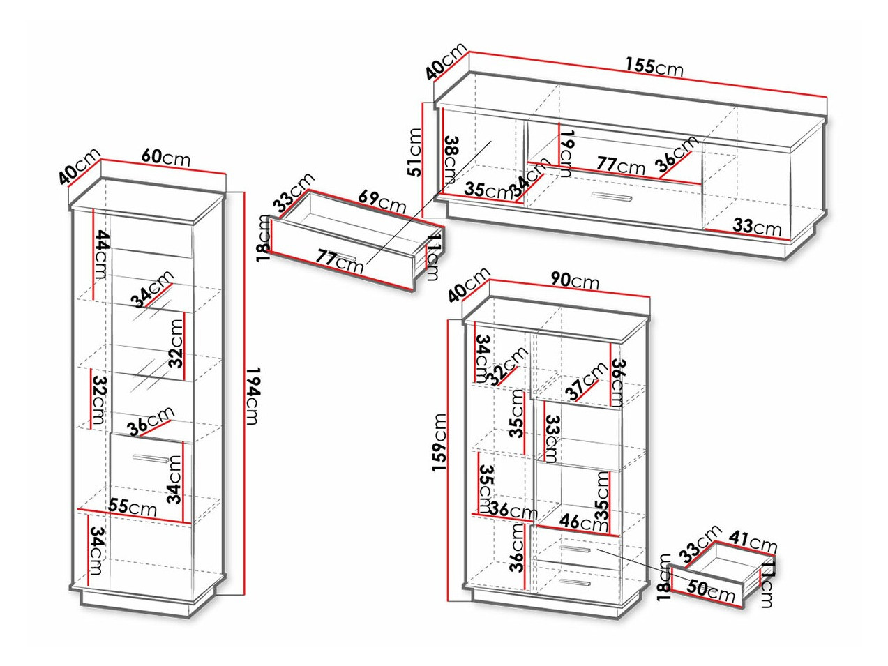 159 x 90 x 40; 194 x 60 x 40 cm