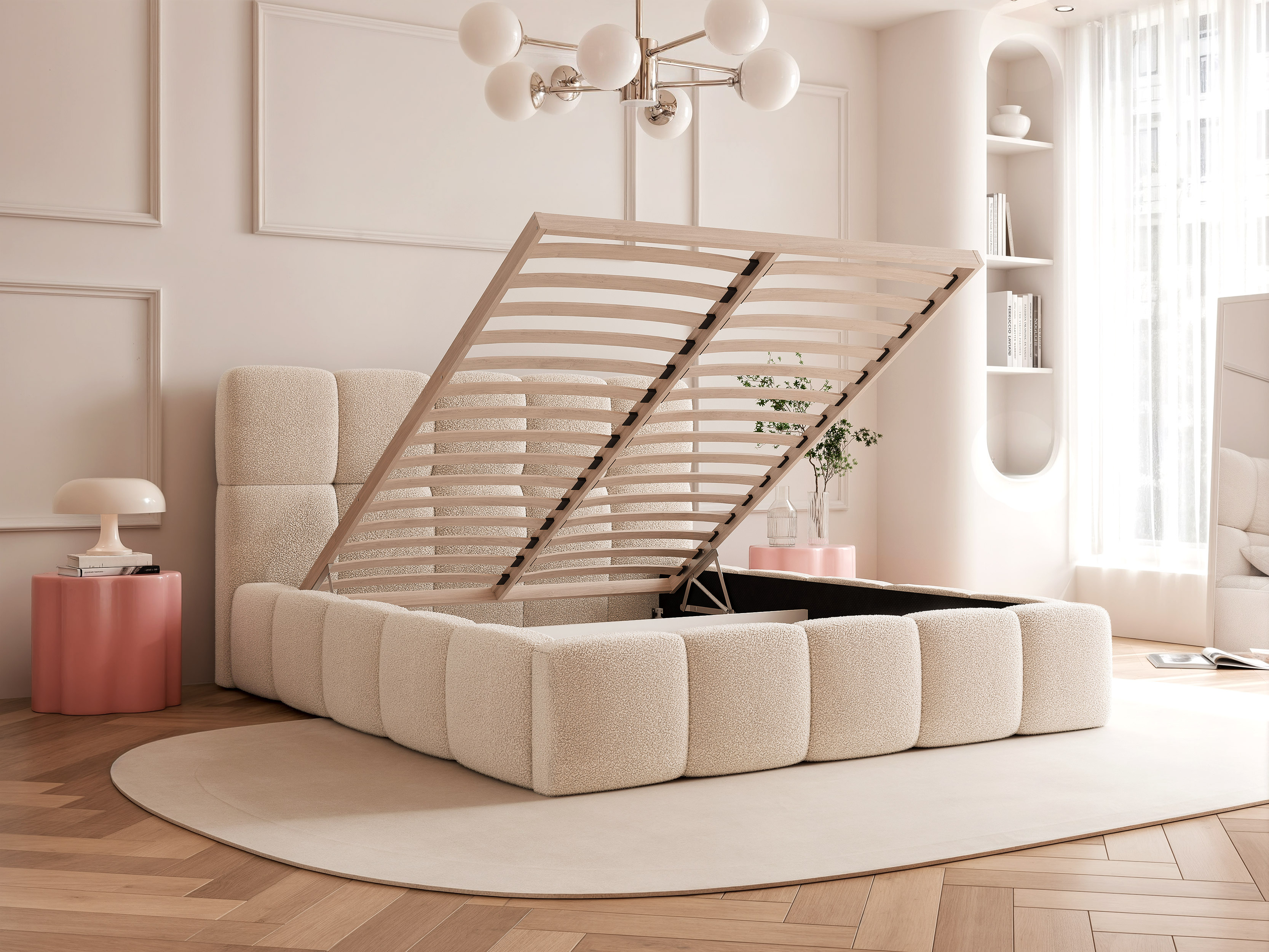 Mekana i nježna tkanina, bez alergenih tvari. Njena jedinstvena tekstura s petljama nadopunjuje skandinavske i moderne interijere, dodajući ugodan i privlačan dodir svakom prostoru. Kako bi se održao izgled i mekoća tkanine, preporučuje se čišćenje površine samo blagim sredstvima za čišćenje posebno dizajniranim za tapecirani namještaj.