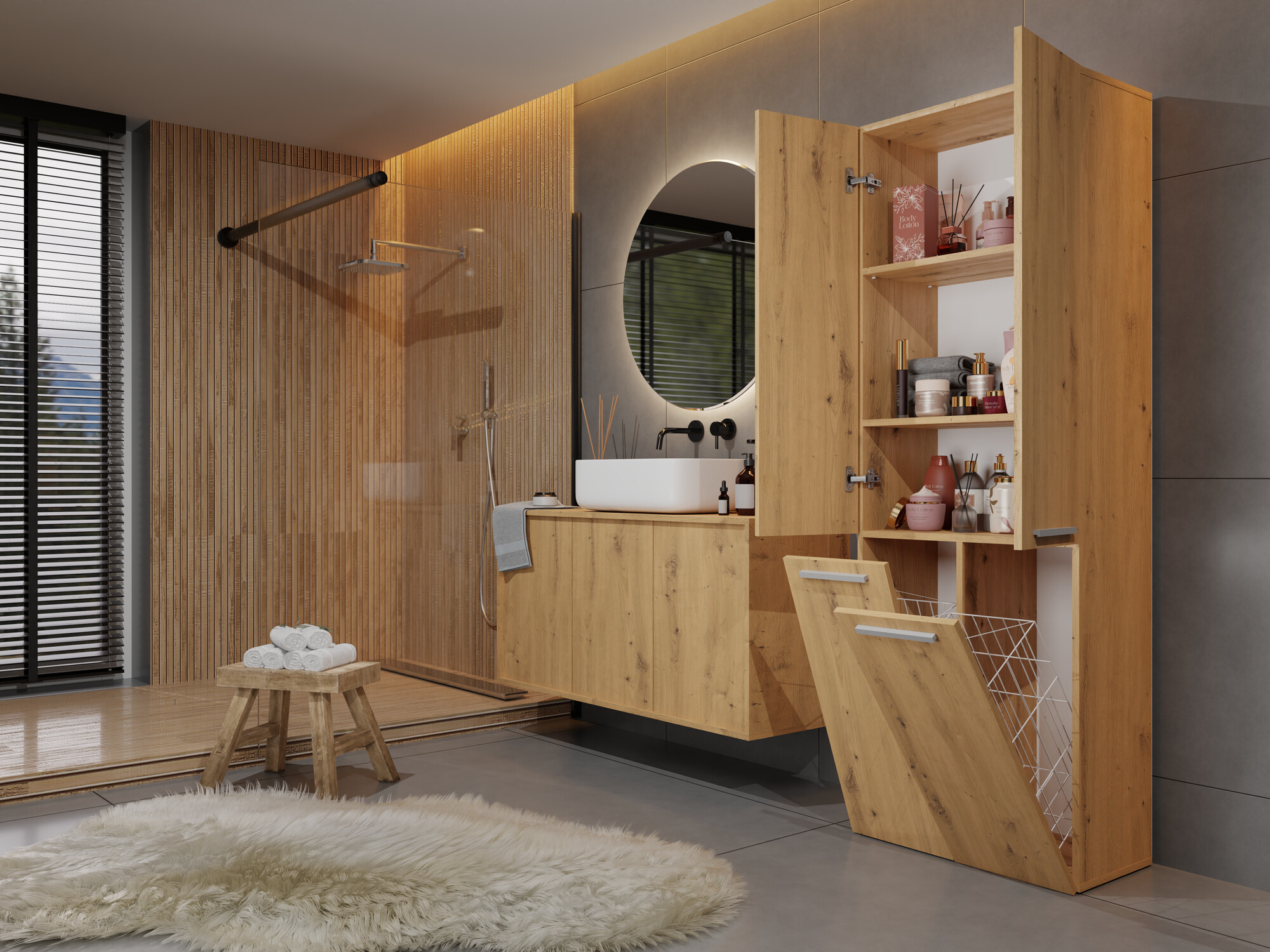 Izgleda kao na slici. Jednostavan sastav. Dovoljno mjesta za odjeću u košarama. U gornjem dijelu također ima dovoljno prostora za razne kupaonske dodatke.