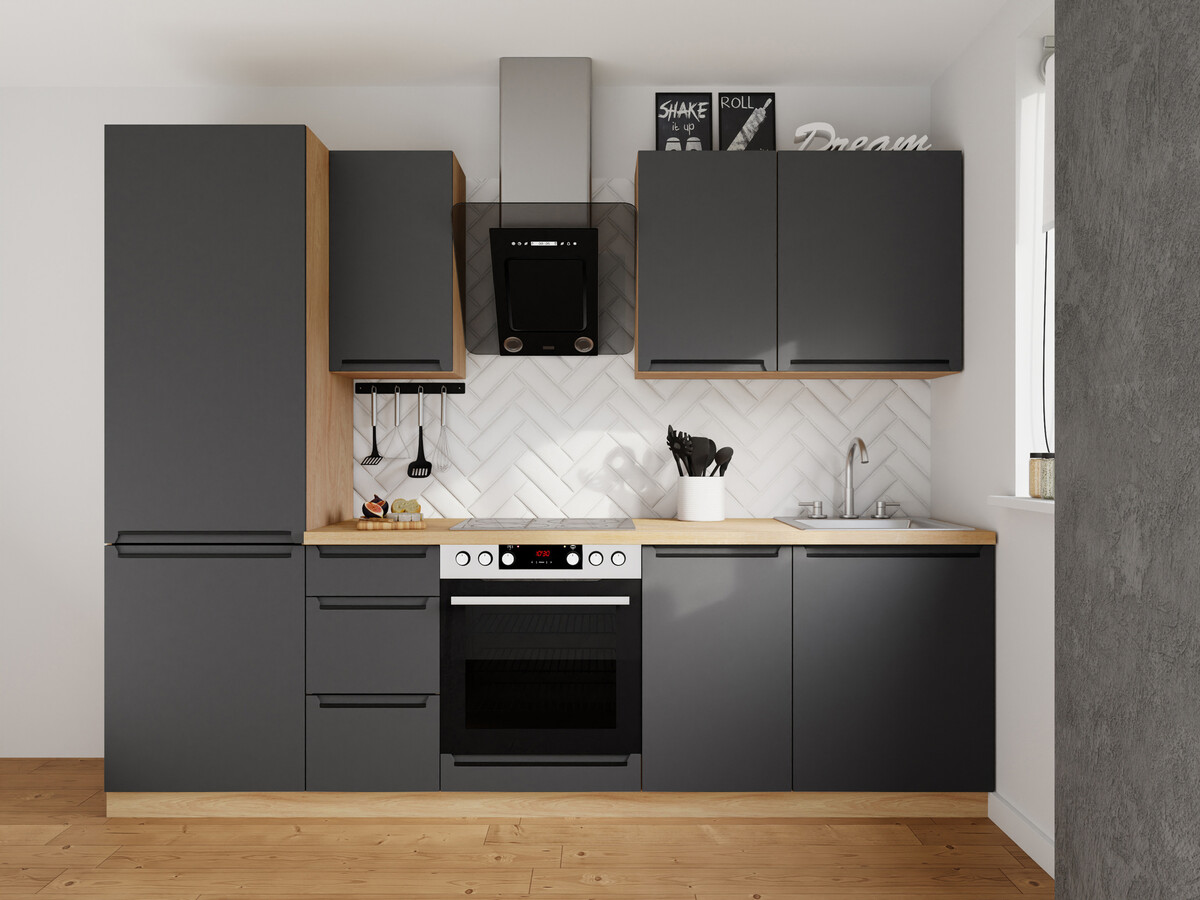Kreirajte jedinstveni kuhinjski prostor pomoću modularne kolekcije kuhinjskog namještaja. Ova kolekcija sadrži različite samostojeće i zidne ormariće, kao i standardne kuhinjske setove. Korpusi ormarića u boji drveta i mat fronte Vašoj kuhinji pružaju dašak suvremenog minimalizma, dok prikrivene ručkice naglašavaju dizajn i pružaju dodatnu udobnost. „Flowbox" ladice s vodilicama za tiho zatvaranje omogućuju glatko otvaranje i zatvaranje.