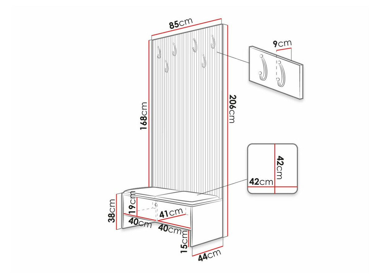 Donji dio ormarića je normalan. Moguće je prekriti jastuke sjedećeg dijela, ako se ukaže takva potreba. Zidni dio uopće nije pričvršćen za donji dio. To je samo ploča za objesiti na zid. Razočaranje. Ukrasne okomite ploče su plastične letvice. Razočaranje. Crne vješalice su plastične i izgledaju jeftino. Razočaranje.