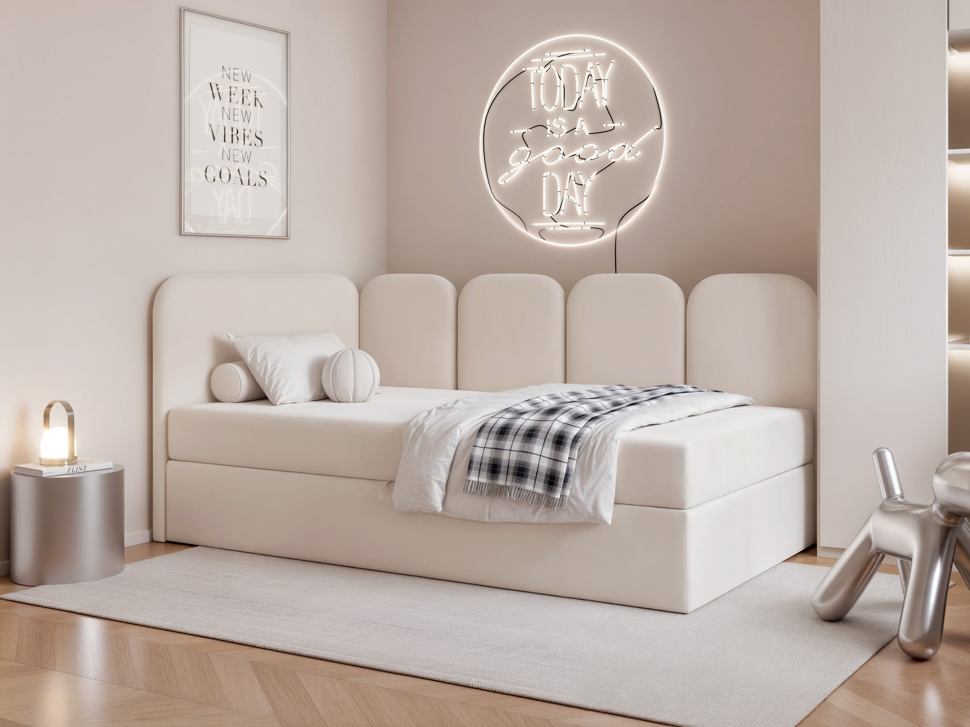Mekana, mat tkanina s površinom otpornom na upijanje tekućine. Prolivene tekućine formiraju se u male kapljice koje se lako mogu ukloniti suhom krpom. Tkanina također nudi povećanu otpornost na ogrebotine uzrokovane kandžama kućnih ljubimaca. Zahvaljujući svojoj nježnoj površinskoj teksturi, tkanina suptilno mijenja nijansu ovisno o osvjetljenju, dodajući dubinu i eleganciju svakom interijeru. Kako bi se održao izgled i performanse, preporučuje se čišćenje površine samo blagim sredstvima za čišćenje, posebno namijenjenim za presvlake.